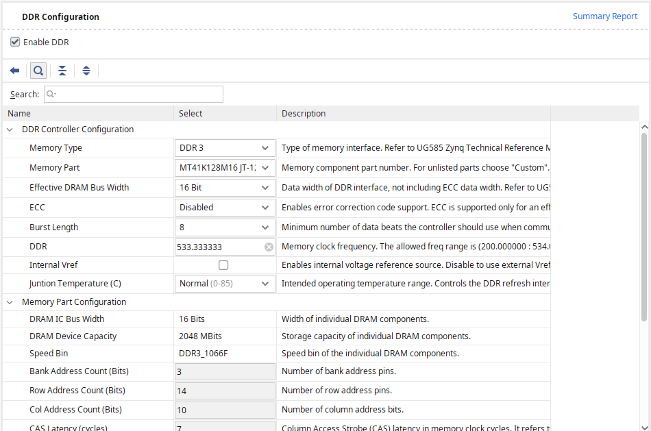 DDR Configurationは、EBAZ4205に搭載されているDDR3メモリに合わせて以下の用に設定します。