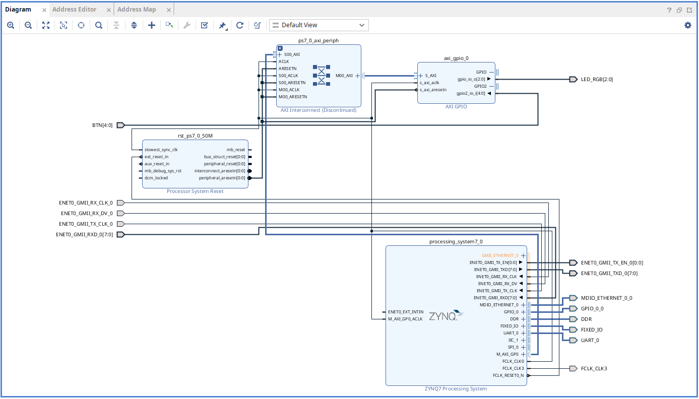 Ether PHYへのTXD/RXDはPSからの出力は8bitですが、PHYの入力は4bitしかないので、未使用の上位4bitはPSの未接続ピンへダミーで接続しています。