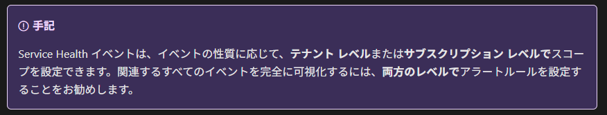 さて、「サービス正常性アラート」は、スコープ(イベントの対象となるサブスクリプション)ごとのイベントを対象に、スコープごとに設定する必要があります。