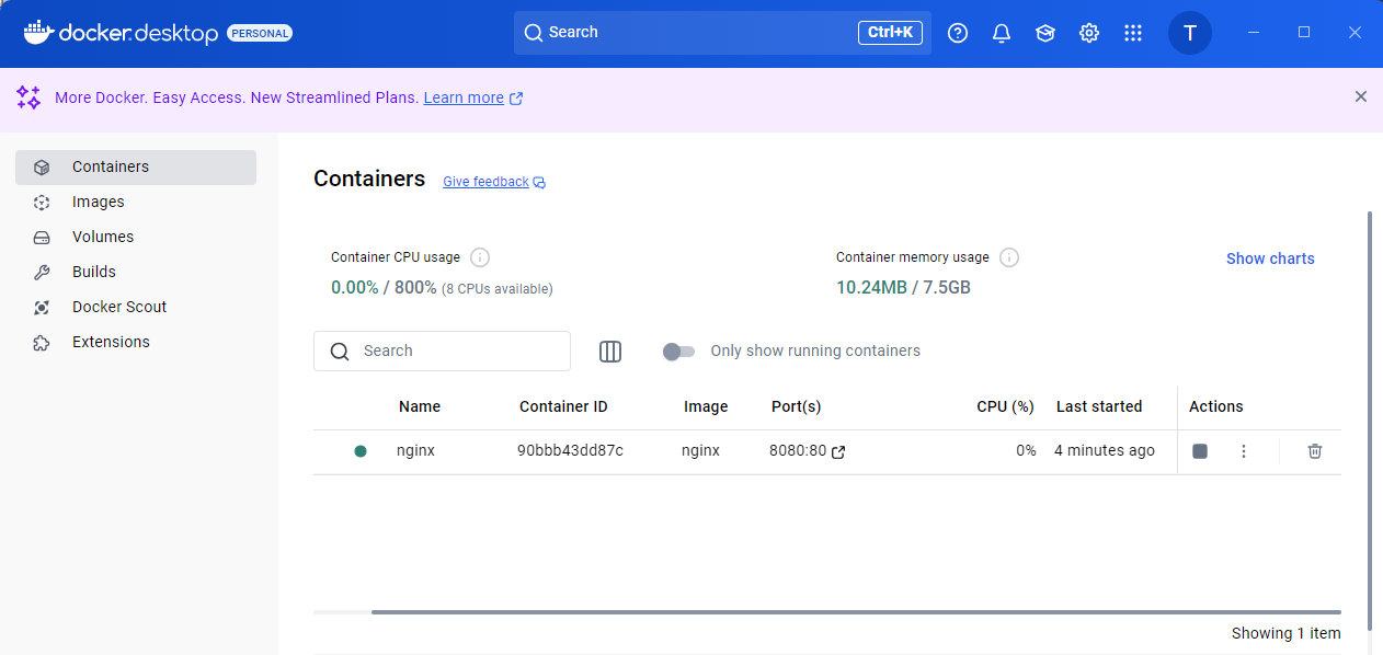 - DockerDesktop > Containerにてnginxコンテナが立ち上がっていることを確認