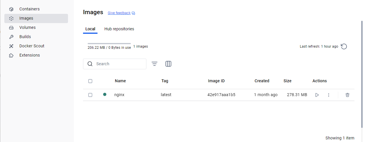 - DockerDesktop > imagesにてnginxイメージが取得できていることを確認