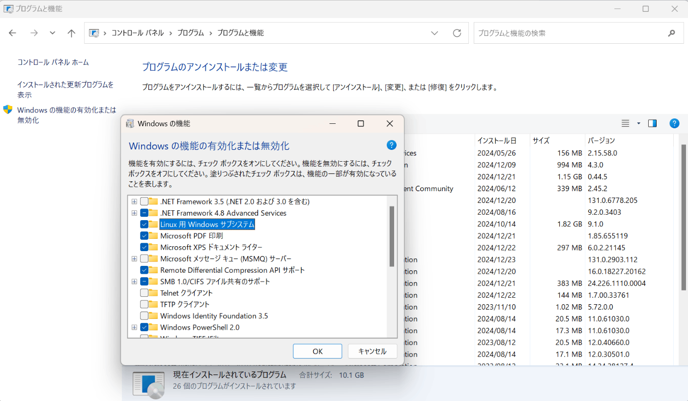 - コントロールパネル > プログラム > プログラムと機能 > Windowsの機能の有効化または無効化より以下2点にチェックを入れOKを押下後、PCを再起動