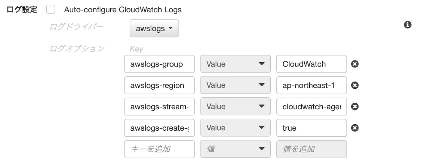 awslogs-create-groupオプションを指定することで、ロググループが自動作成される。