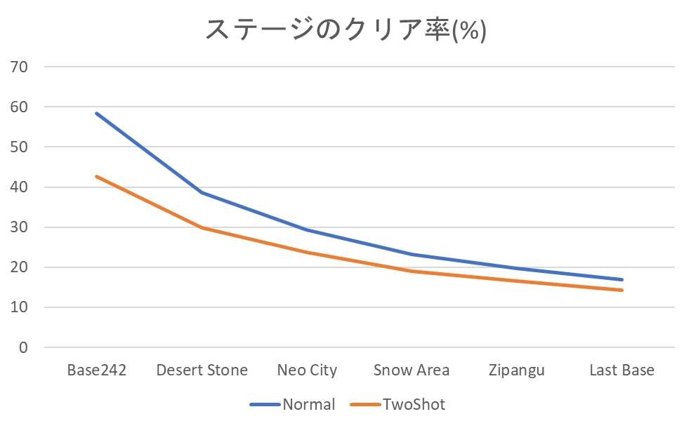 という特徴が見て取れます。そのことから、極端にクリア率が落ちているステージはないと見て取れるので、おおむね開発の想定通りにユーザーがプレイしています。