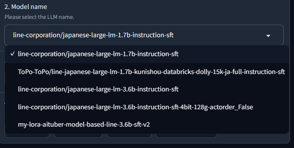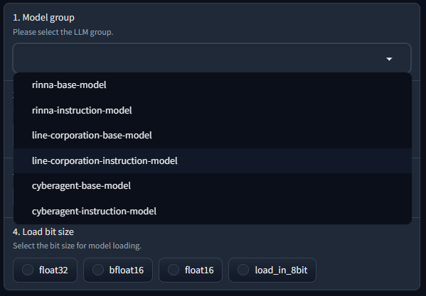 使用したい具体的なモデルを選択します。今回は、"line-corporation/japanese-large-lm-1.7b-instruction-sft"を選択しました。1で設定したグループに含まれるモデルのみがプルダウンで表示されるようにしています。