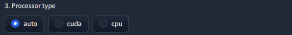 - 使用するプロセッサを選択します。文章の生成をGPUもしくはCPUの両方もしくはどちらかを使用するか設定します。今回は、"auto"を選択しました。特別な理由がない場合は、"auto"の使用を推奨します。