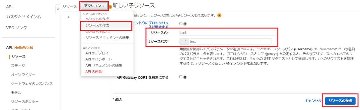 アクションからリソースの作成を選び任意のリソース名を入力してリソースの作成をクリックします。