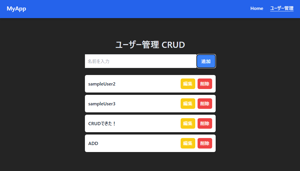 フロントの CRUD 操作が DB に反映されて連携しているのを実感できると、とても感慨深い。