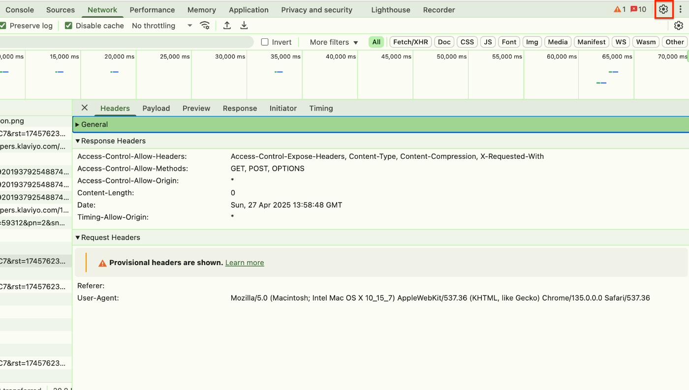 開発ツールのリクエストヘッダの内容をよく見てみると、以下のように Provisional headers are shown...