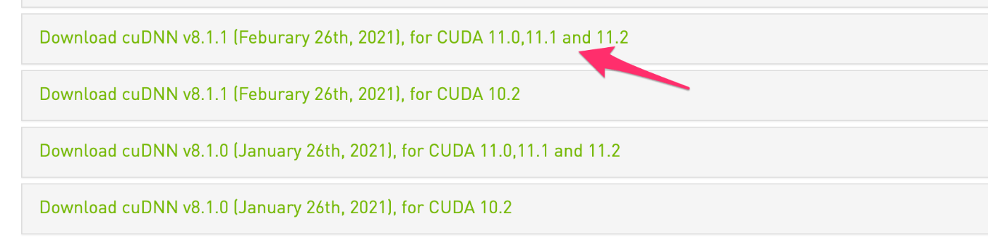 こんな画面になるので、cudaの11.2に合わせたバージョンを使います。