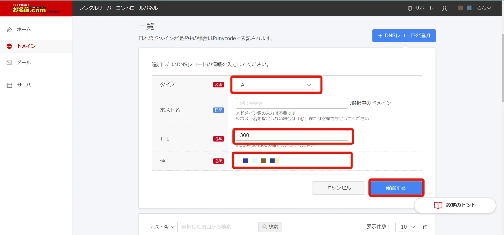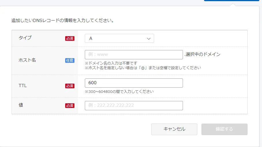 「タイプ」にAレコード、「TTL」は300としていますが、他の設定に合わせて600以上がおすすめです。「値は」IPアドレスを入力して、「確認する」をクリックして、完了します。