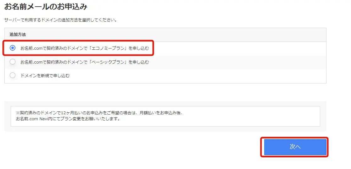 今回は「エコノミープラン」を申し込みますが、適宜選択してください。