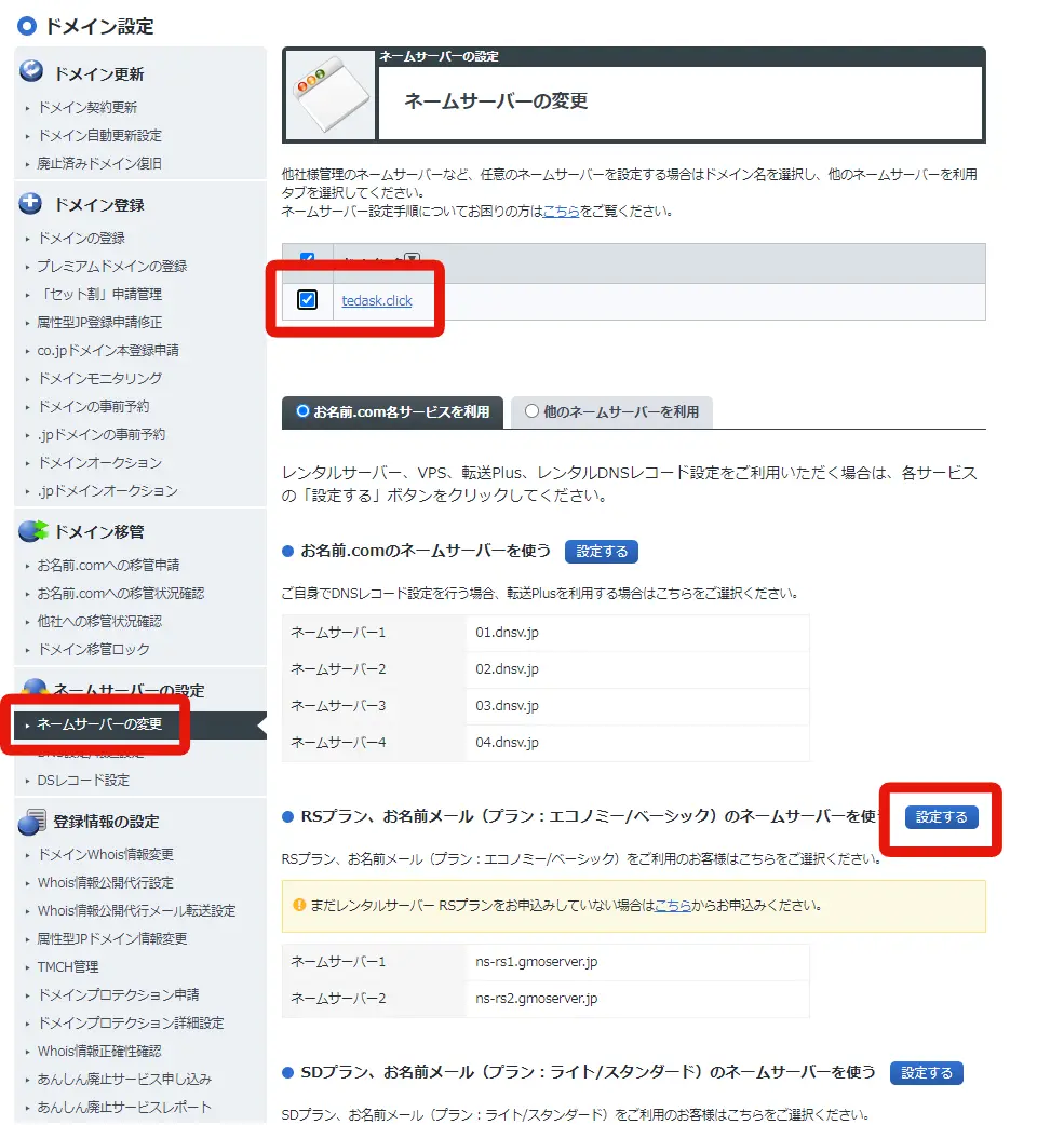 設定するドメインにチェックが入っていることを確認して、「RSプラン、お名前メール(プラン:エコノミー/ベーシック)のネームサーバーを使う」の「設定する」をクリックします。