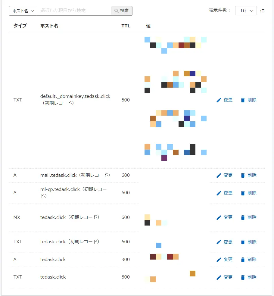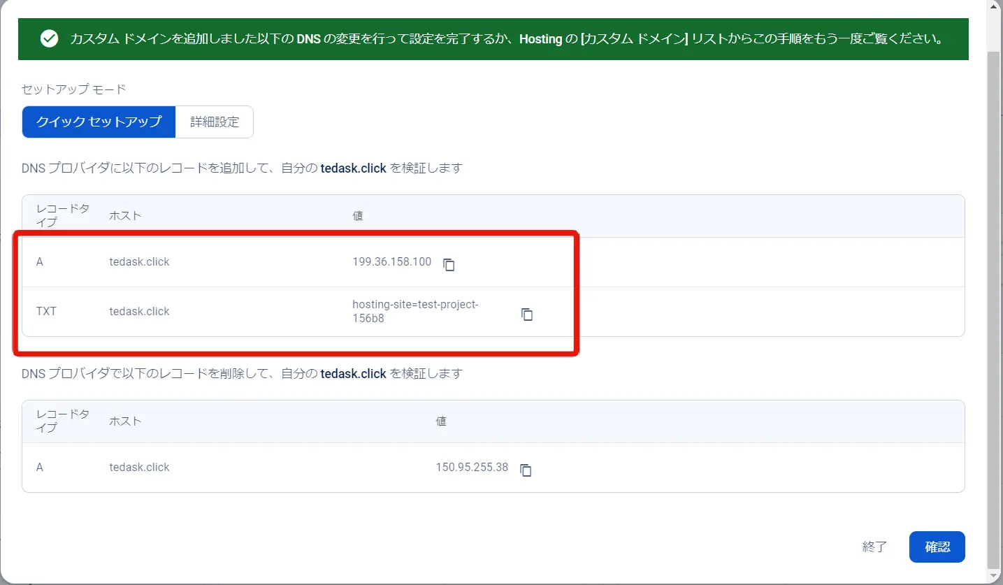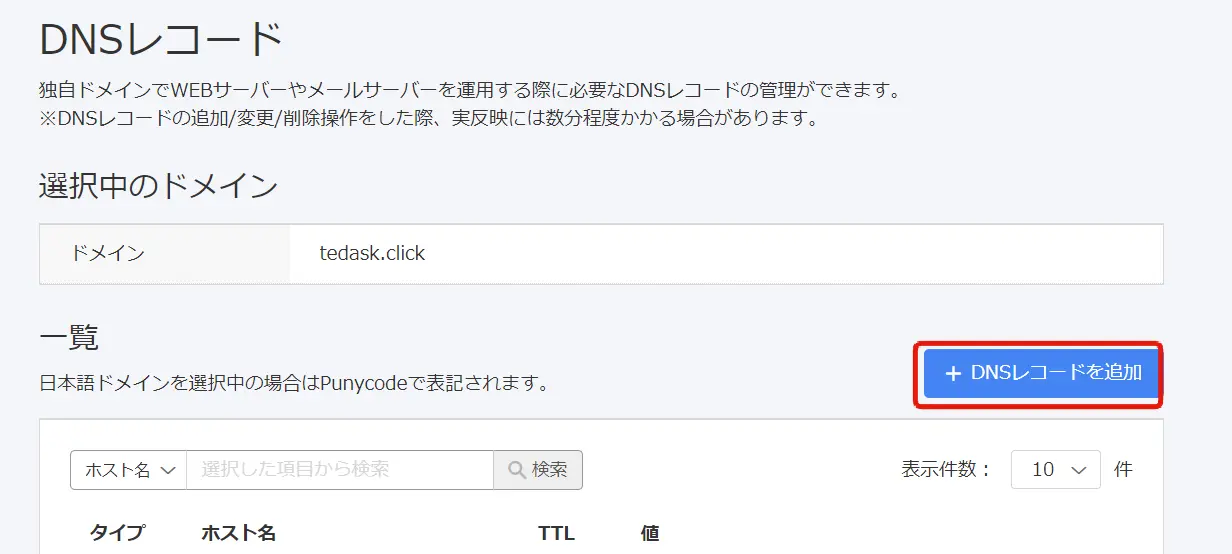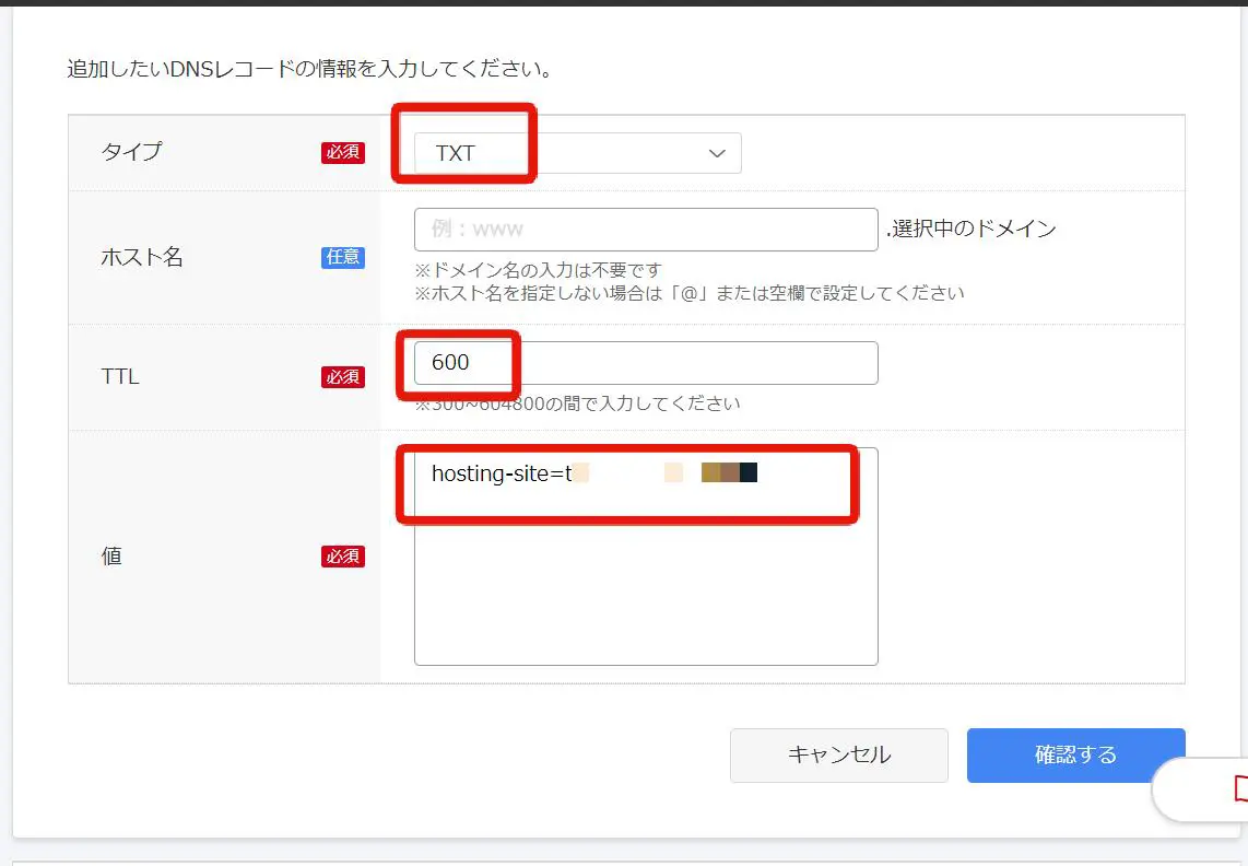 入力欄が表示されたら、DNSレコードを入力していきますが、この内容は先程FirebaseのHostingで表示されていた値を入力します。