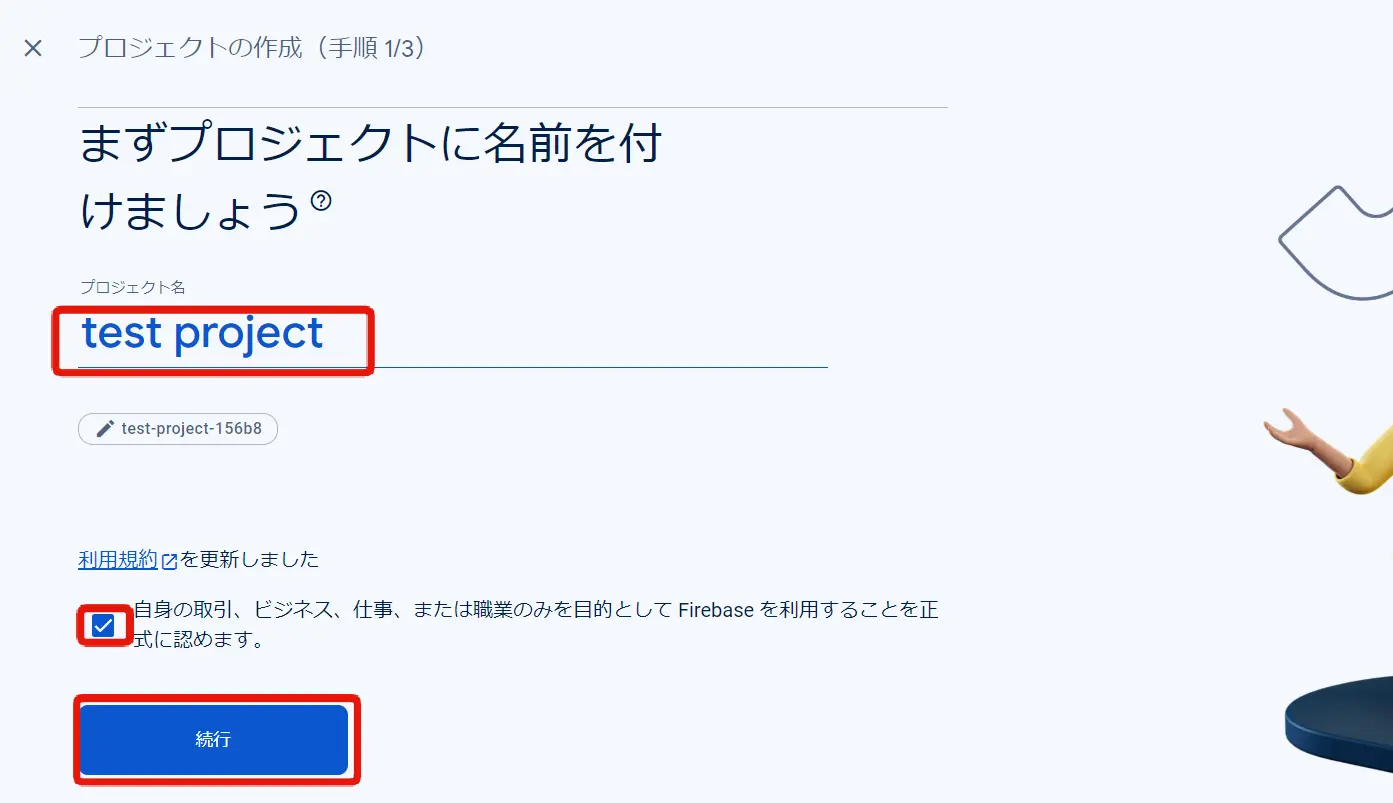 「プロジェクト名」に適宜、半角英数字で名前を入力して、「続行」をクリックします。