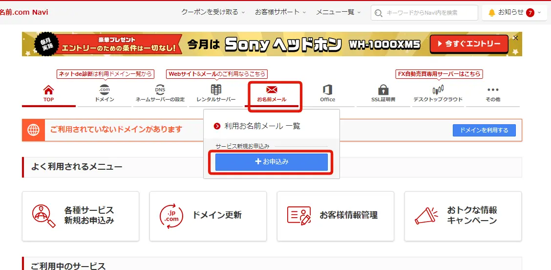 ヘッダーメニューの「お名前メール」→「お申し込み」をクリックします。