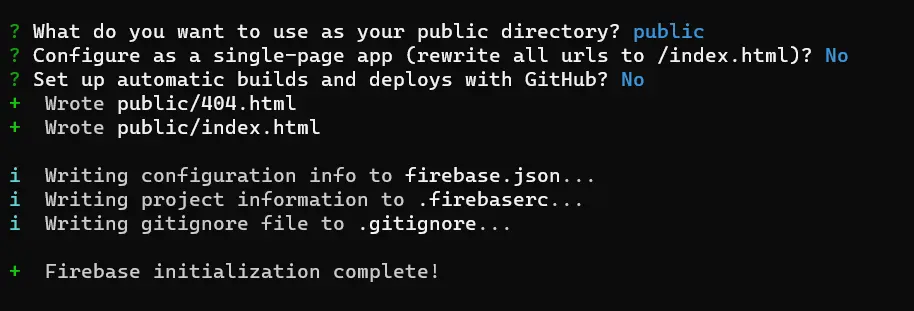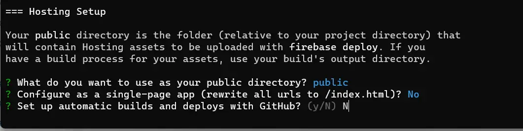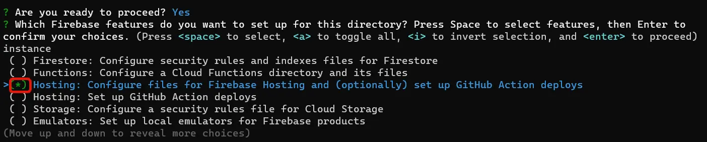 カーソルを「Hosting」 Hosting: Configure files for Firebase Hosting and (optionally) set up GitHub Action deploysに合わせて「Space」キーを押下します。