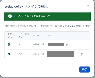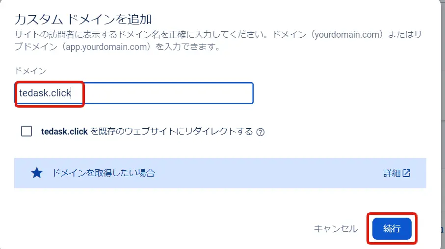 用意した独自ドメインを入力して「続行」をクリックします。今回は例として「tedask.click」というドメインを設定してみます。