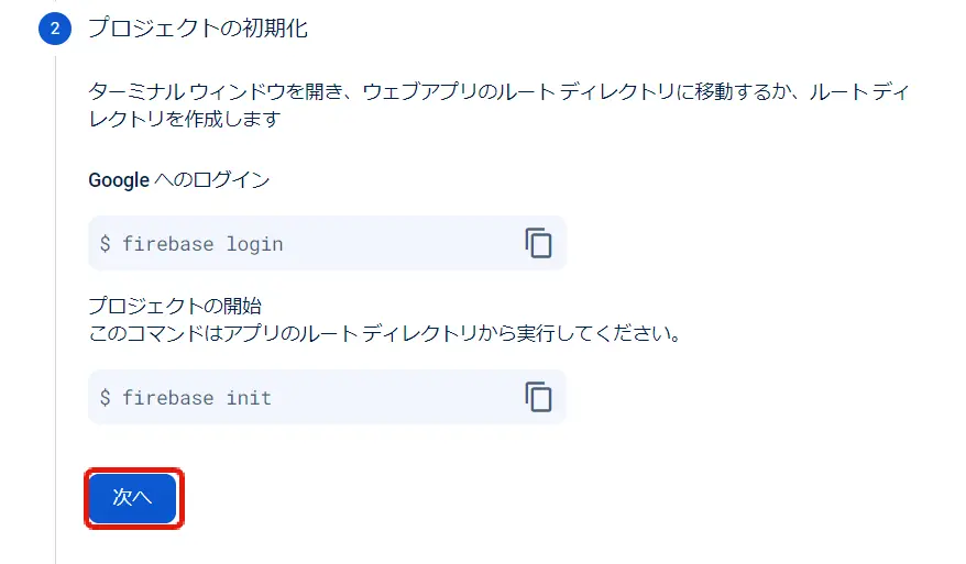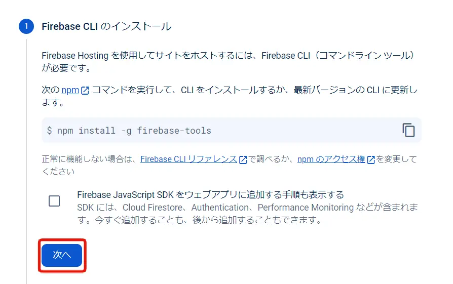 Firebase CLIのインストールという画面が出てきますが、この後の作業は先程完了していますので、全て「次へ」をクリックしてください。