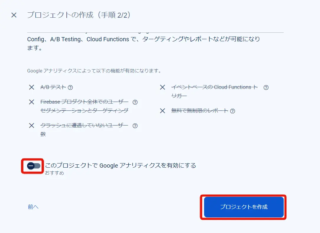 Googleアナリティクスを利用するか聞かれるので、必要であればONの状態で「プロジェクトを作成」をクリックします。今回は不要のためOFFにしています。