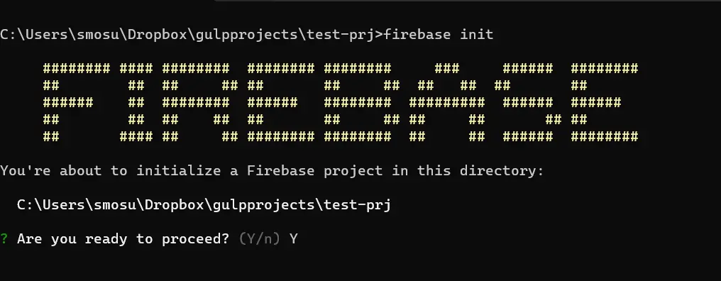 コマンドプロンプトに戻り、プロジェクトフォルダに移動して、初期化をします。