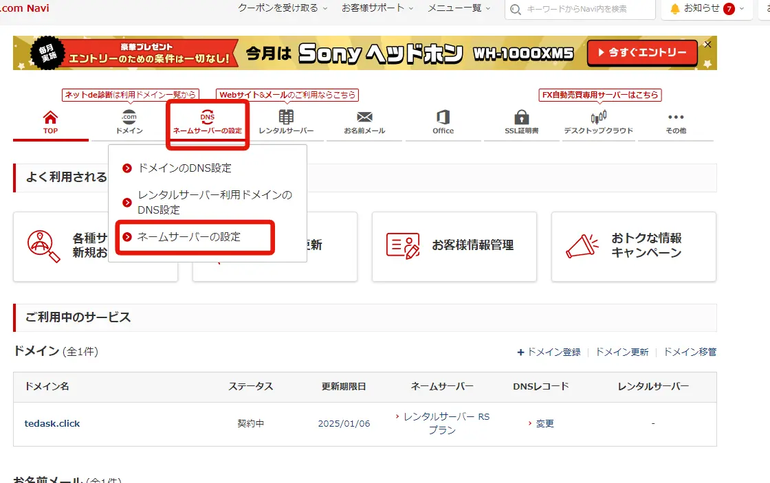 ヘッダーメニューの「ネームサーバーの設定」→「ネームサーバーの設定」をクリックします。