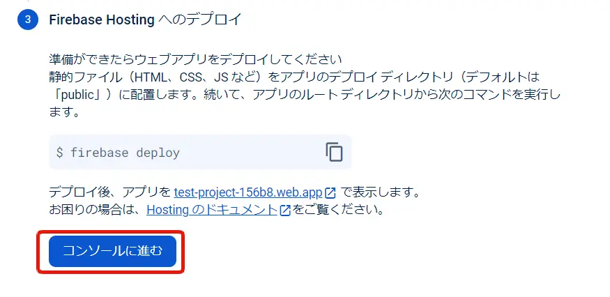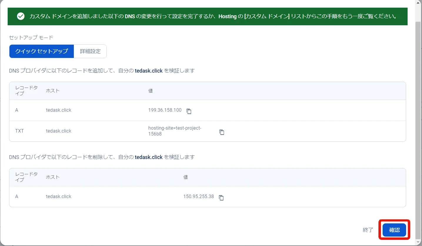 Firebaseの画面のホスティングページに戻り「確認」ボタンをクリックします。