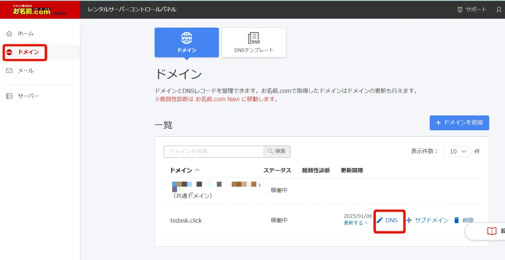 レンタルサーバーコントロールパネルに入ったら該当のドメインの「DNS」をクリックします。