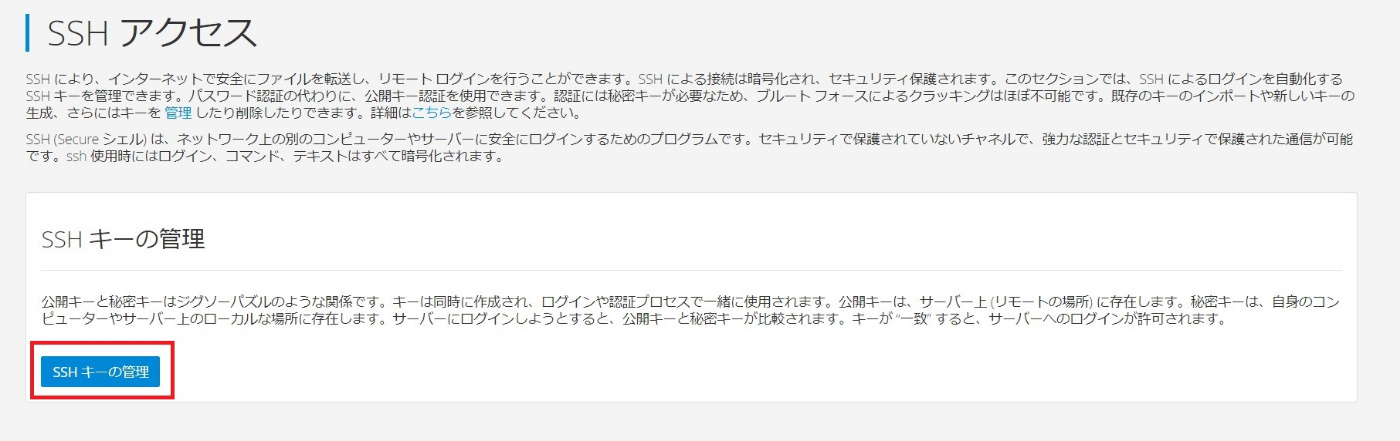 セキュリティの項目の「SSHアクセス」をクリックします。