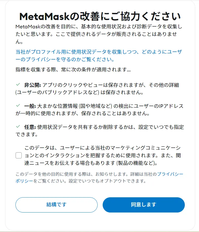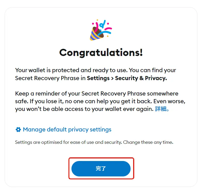 この復元出来ないことを理解しているというのはどういうことかというと、冒頭でウォレットは仮想通貨やNFTなどの資産を管理するものと説明しましたが、パスワードが分からなければ(パスワードを忘れたら)その持っている資産もアクセス出来なくなりますよ!という念押しをしているわけです。