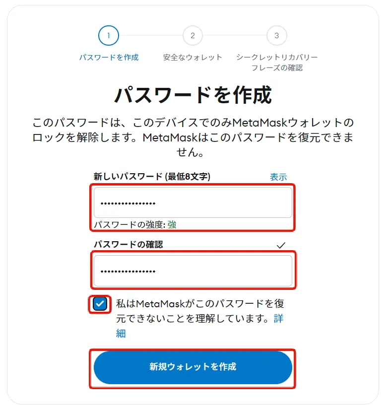 復元出来ないことを理解しているにチェックを入れて、「新規ウォレットを作成」をクリックします。