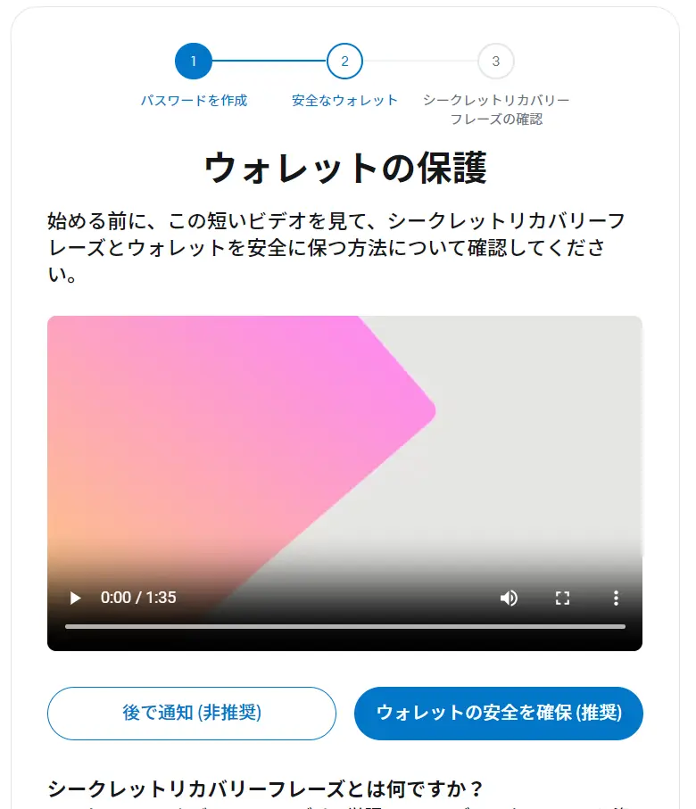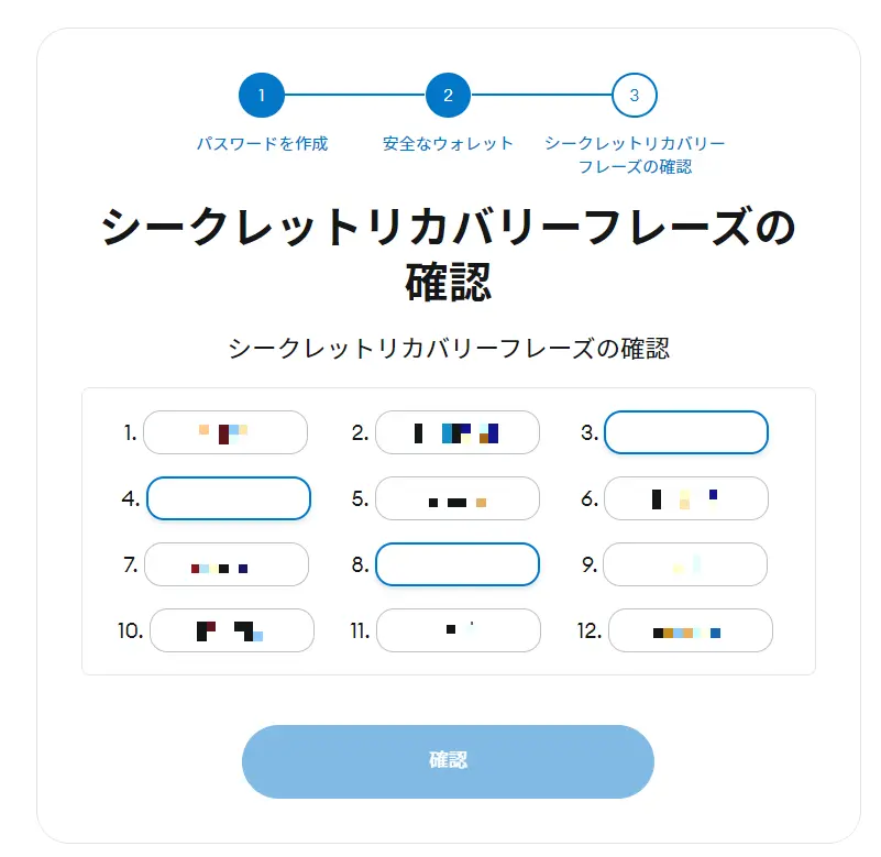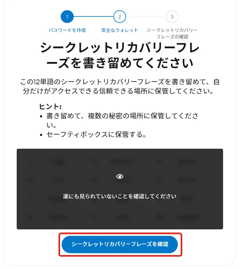 「シークレットリカバリーフレーズを確認」をクリックして表示されたリカバリーフレーズを必ず控えてください。(パスワード同様にこの後に確認することは出来ません)