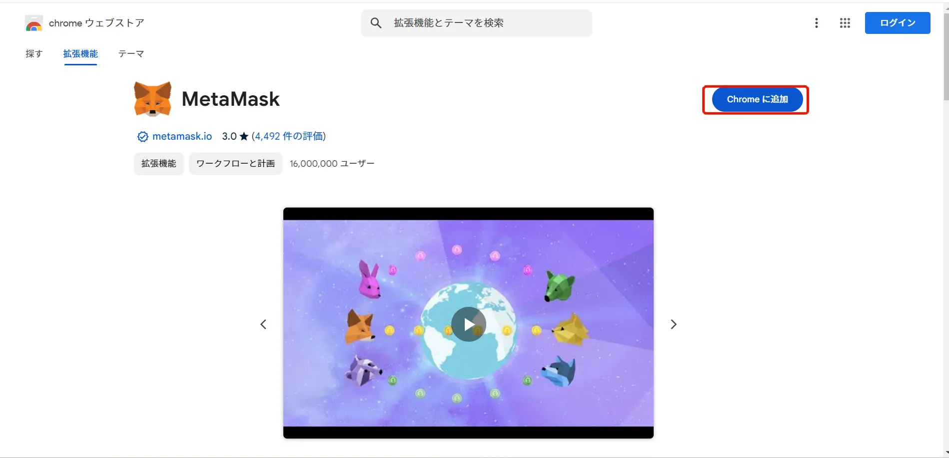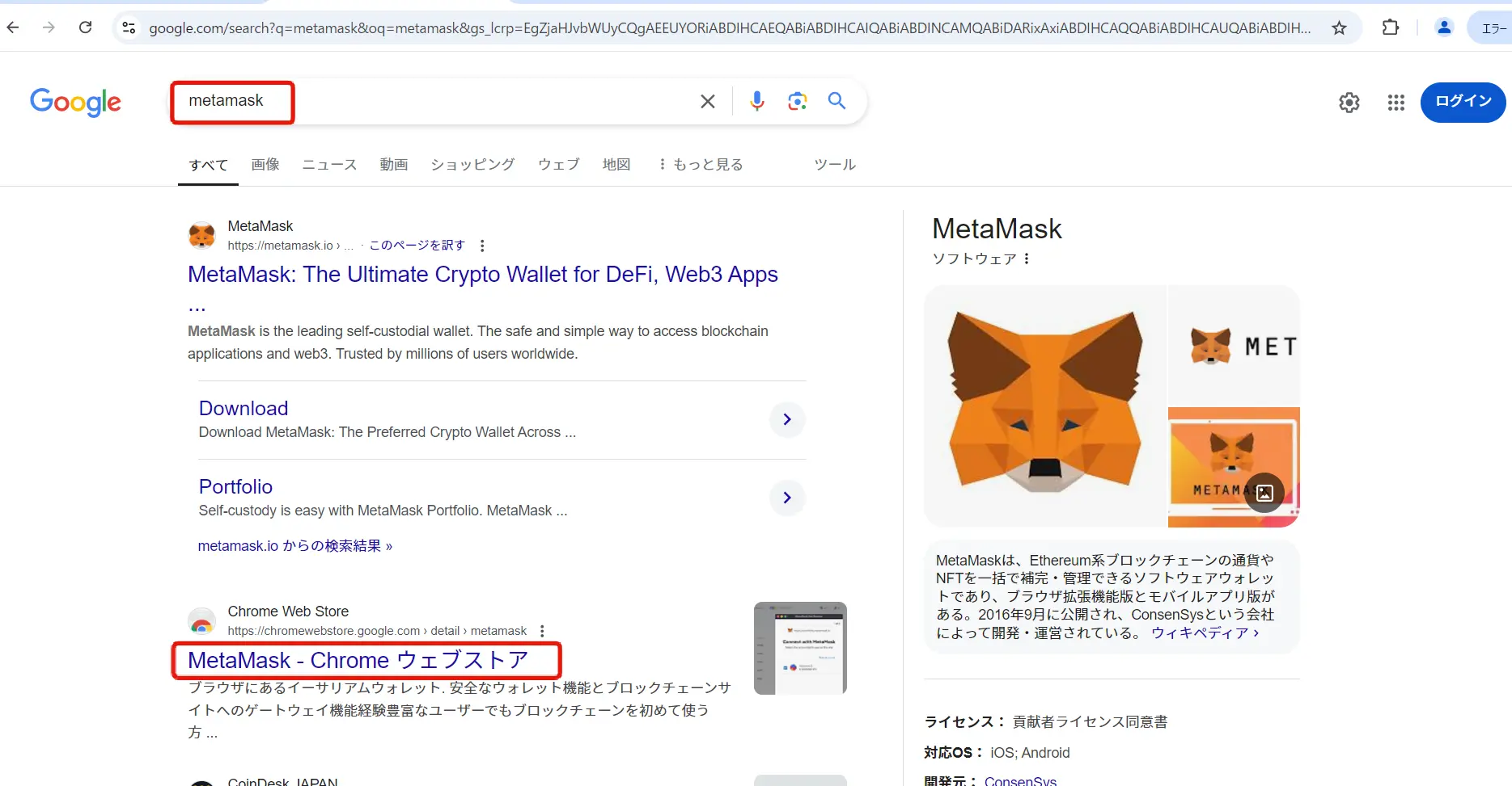 google検索で「metamask」で検索すると、MetaMaskの公式サイトの下にChromeウェブストアが出てくるので、クリックします。