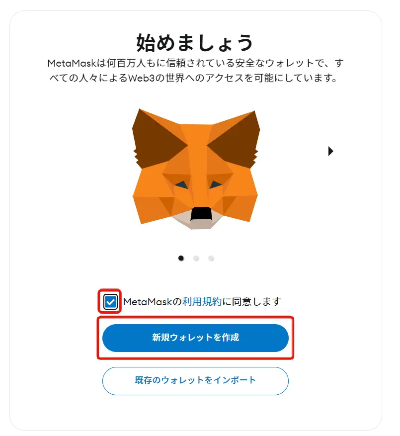 画面が変わってウォレット作成画面に移動するので「利用規約」にチェック、「新規ウォレットを作成」をクリックします。