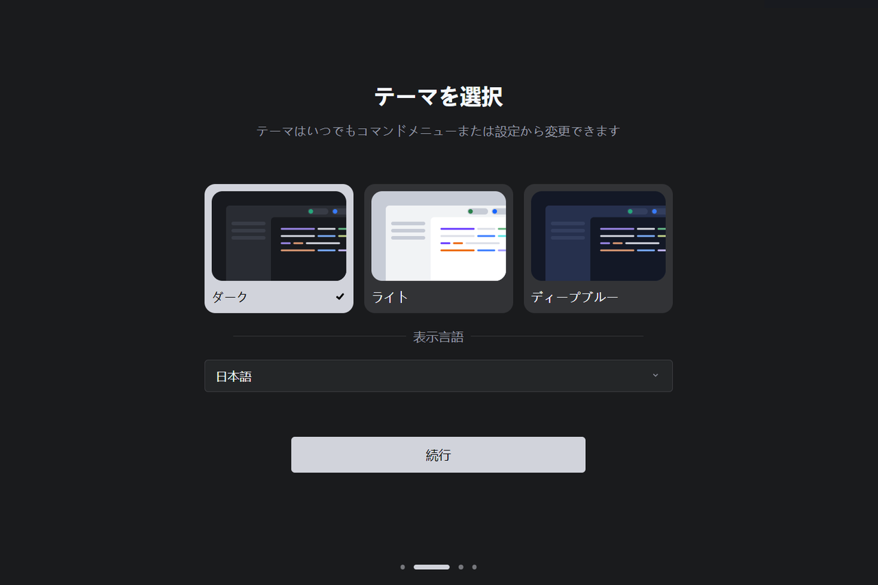 テーマと言語の設定は、あとからでも設定センターで変更できます。 - 続行 をクリックします。