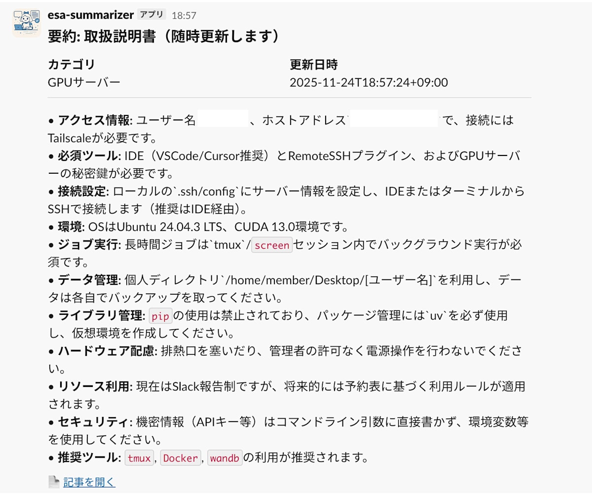 私の研究室では、教授が毎日 esa(情報共有サービス)に膨大な量の情報を共有してくれます。非常にありがたいのですが、投稿頻度が高く、全てのドキュメントをじっくり読む時間が取れないのが悩みでした。なので、投稿されたドキュメントの内容を要約してくれるものがあれば、隙間時間でもサッと内容を把握できるのに...と考えていました。