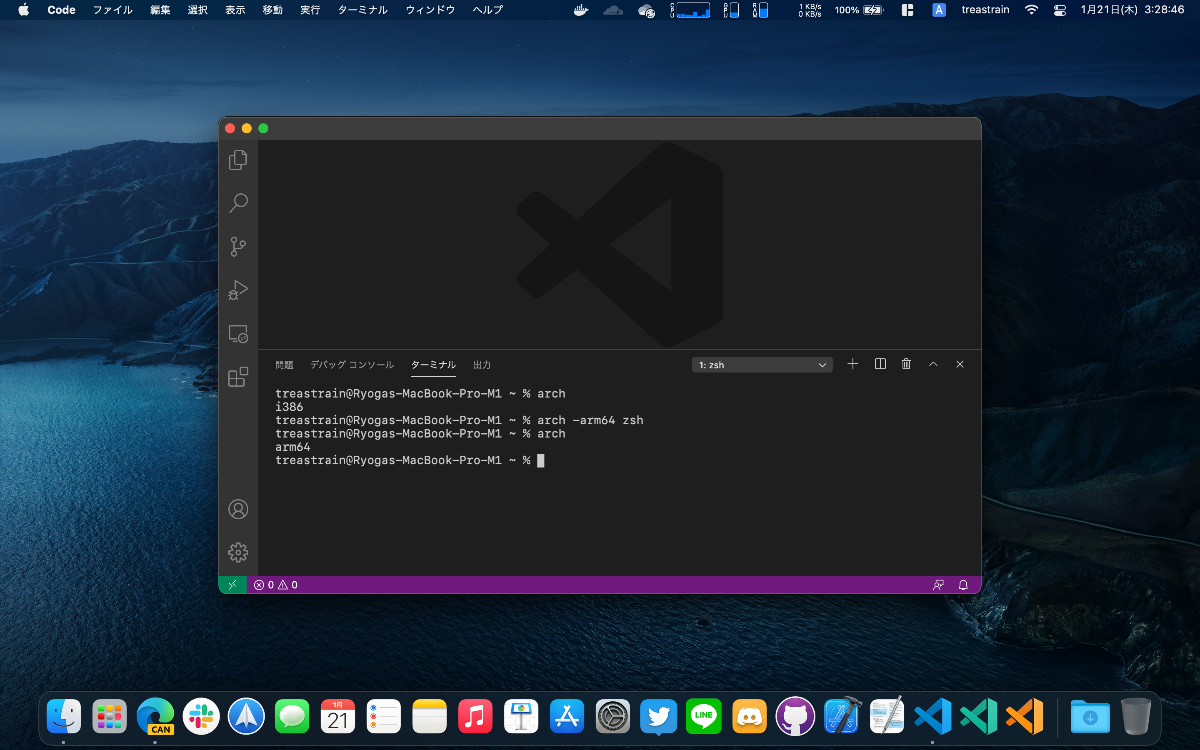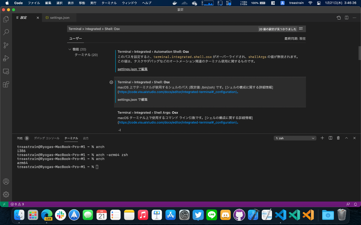 以上の設定で、Visual Studio Code のターミナルを開くと /usr/bin/arch -arm64 zsh