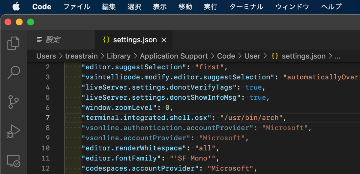 Visual Studio Code 設定の「Terminal › Integrated › Shell: Osx」から「settings.json で編集」に進みます。