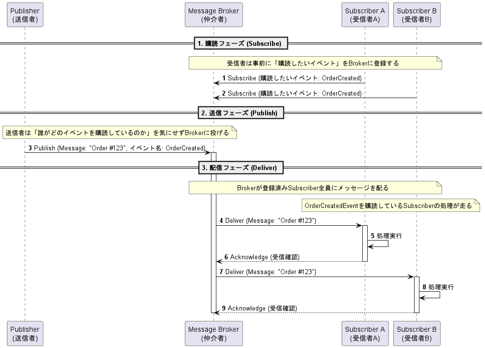 情報の発信者(Publisher)と受信者(Subscriber)が互いを直接知ることなく、仲介役(Message Broker)を介してメッセージをやり取りする疎結合な仕組みです。