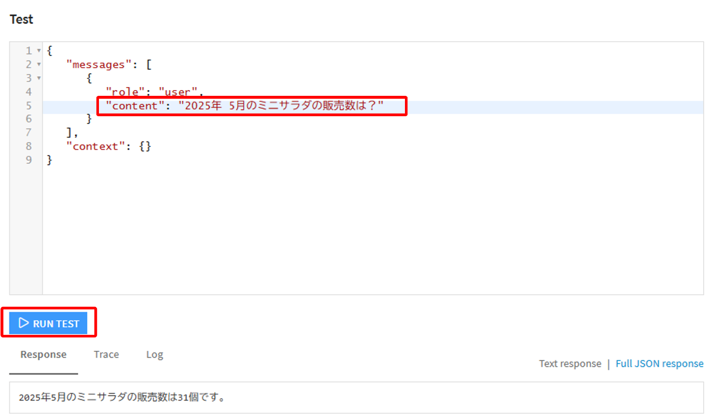 これで設定は終了ですが、試しに左側のTestのcontextに質問を入力し、RUN TESTをクリックすると、どんな回答をするのかをテストすることができます。