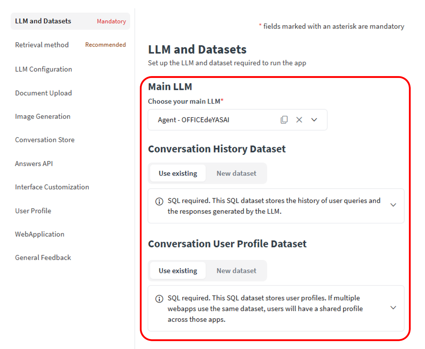 Conversation History DatasetとConversation User Profile Datasetはすでに作成済みのテーブルがあるのでそれを選択しました。