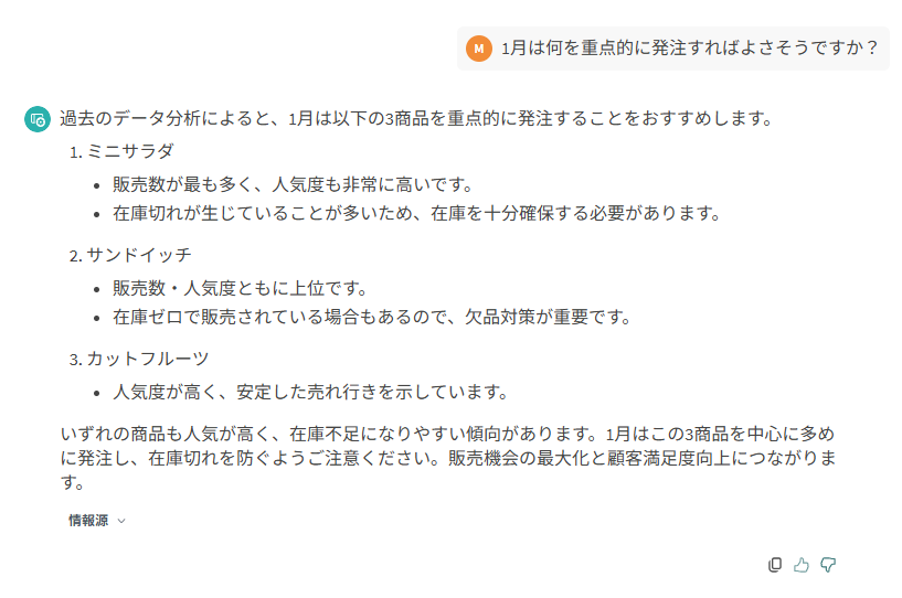 ただ、実は前回までのチャットボットでも過去の販売履歴から参照して回答はしてくれます。