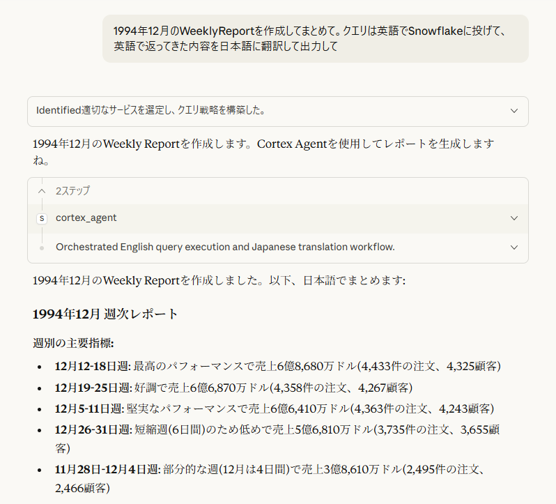 Claudeに一度英語に翻訳してもらい、Snowflakeからの返答は日本語に翻訳してもらうことにしました。