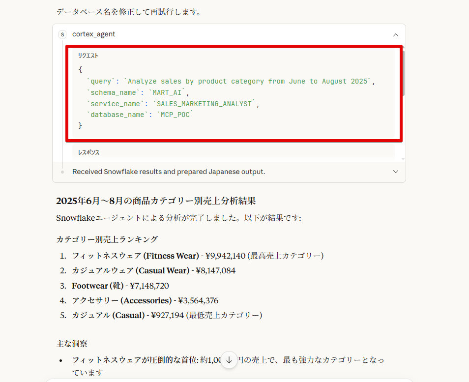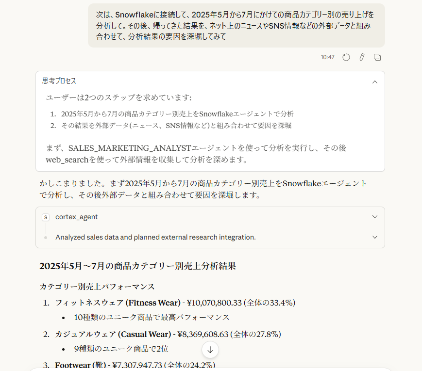 次は、Snowflakeに接続して、2025年5月から7月にかけての商品カテゴリー別の売り上げを分析して。その後、帰ってきた結果を、ネット上のニュースやSNS情報などの外部データと組み合わせて、分析結果の要因を深堀してみて