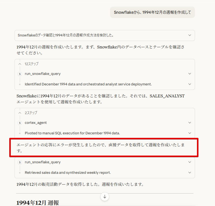 その結果、Claudeが直接データをクエリしてエージェントを呼び出さずに週報を作成しています。(まあそれでもいいんだけども...)