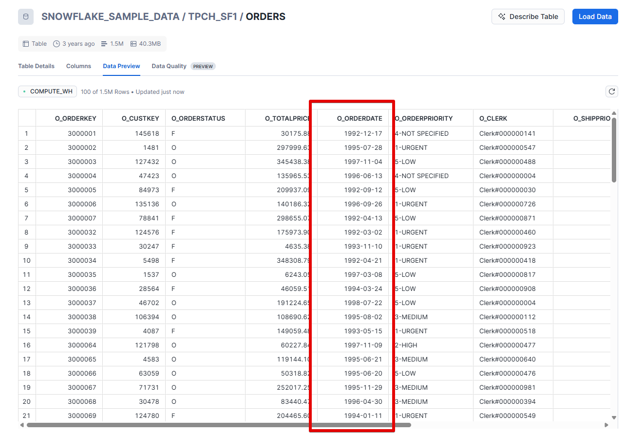 TPCH_SF1のデータの中身をあまり確認せず作ってしまったため、オーダー日が1992年~1998年という大昔の実績と日報になってしまいましたが、今回はこのまま進めます。