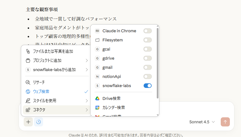 この状態で、チャット画面の「+」→コネクタを確認して、snowflakeを有効化しましょう。
