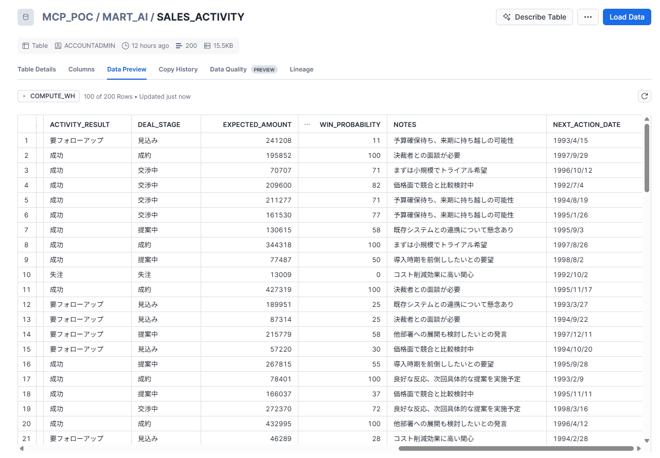 - 基本的にSnowflakeMCPを使って、Snowflakeのエージェントを呼び出してSnowflakeのエージェントに分析させてください。