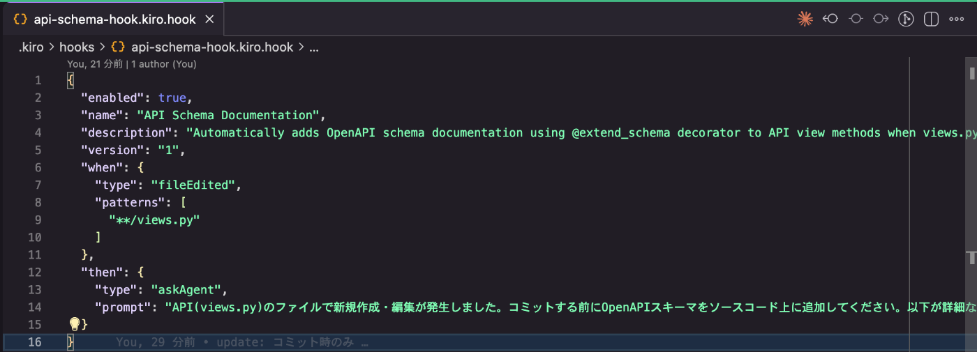 - エディタサイドバーのクラゲ?を選択し、agent hooksの「+」で作成できます!