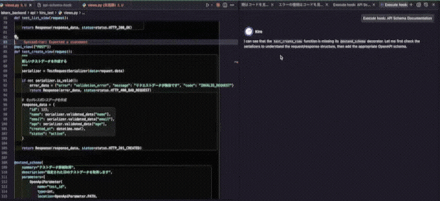 - 試しにテスト用のview.pyを作成し、OpenAPIスキーマがない状態で保存すると・・(画質荒くてすみません。zennは動画が載せられずgifにしました)